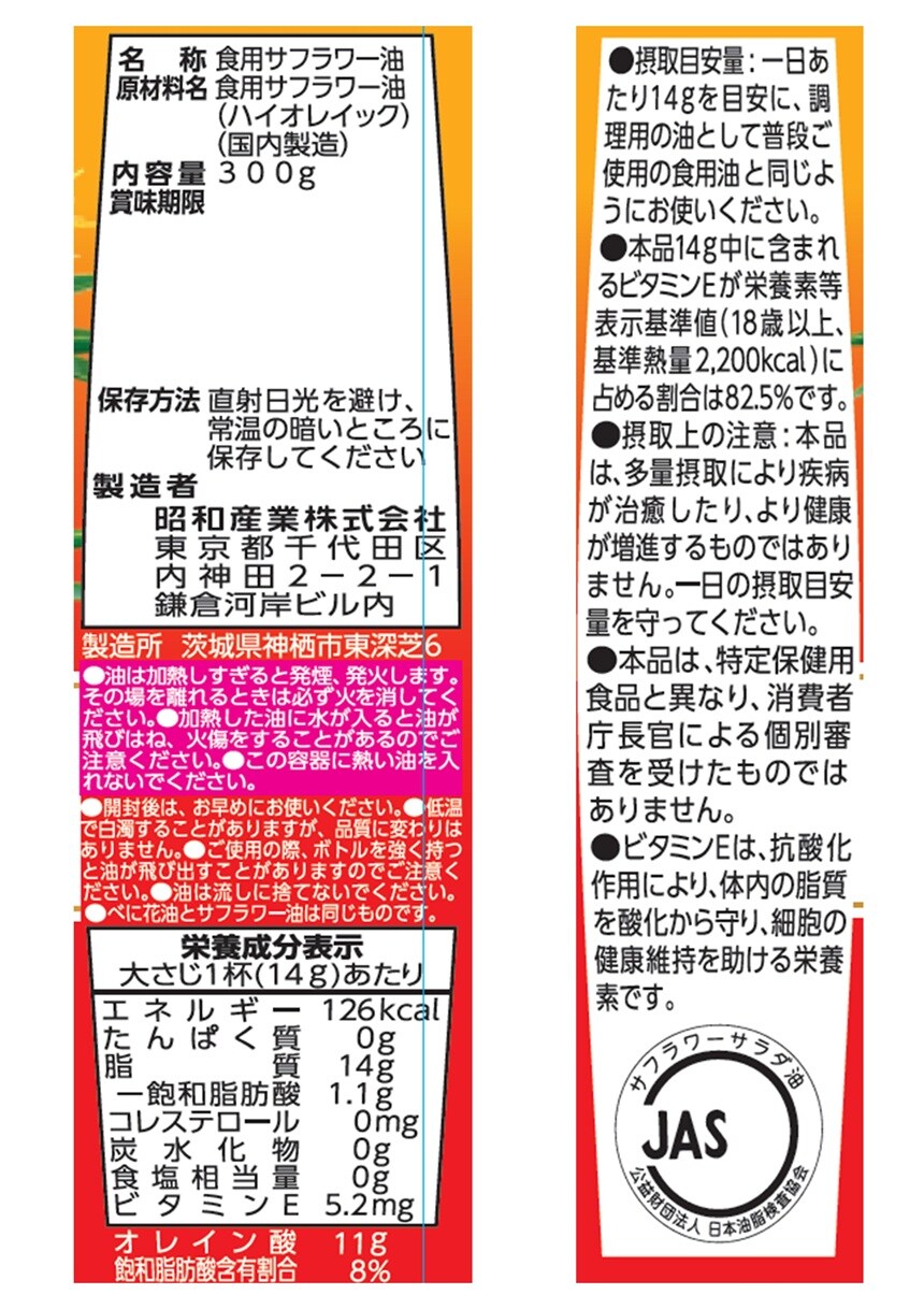 [36本]昭和産業 一番搾りべに花油 300g | オレイン酸たっぷり一番搾りのべに花油(栄養機能食品)