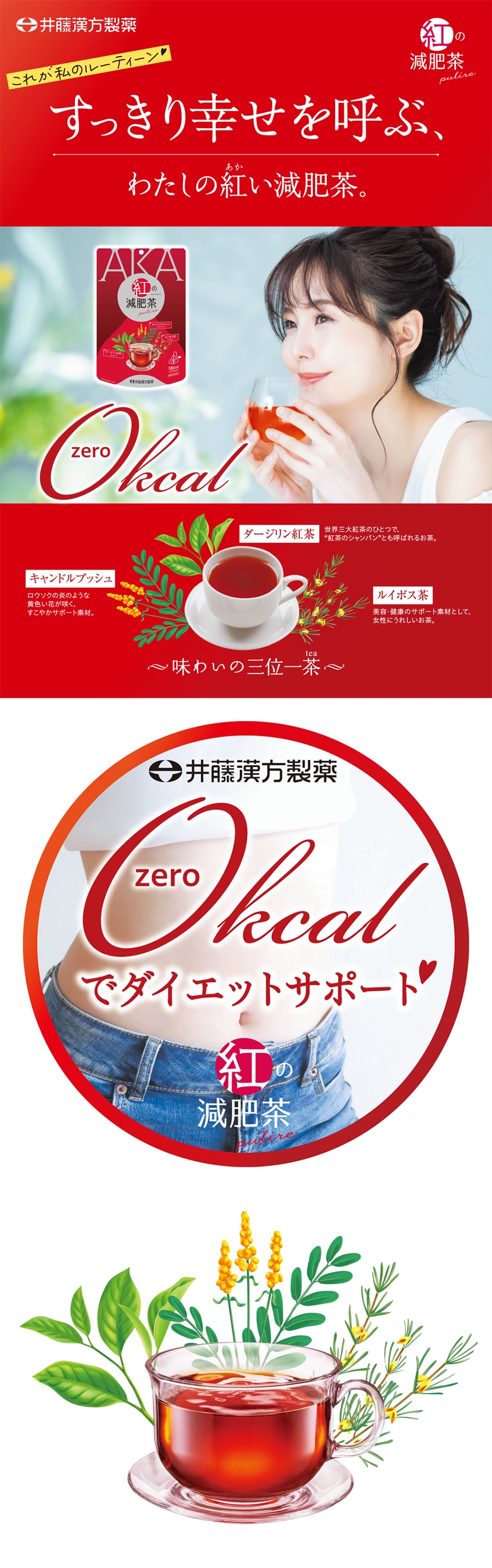 女性に人気の「ダージリン紅茶」「ルイボス茶」+健康茶素材「キャンドルブッシュ」の3種を配合した、紅茶ベース、赤褐色の液色の減肥茶です。ひも付き三角ティーバッグタイプ。0kcalですっきりおいしくダイエットをサポートします。