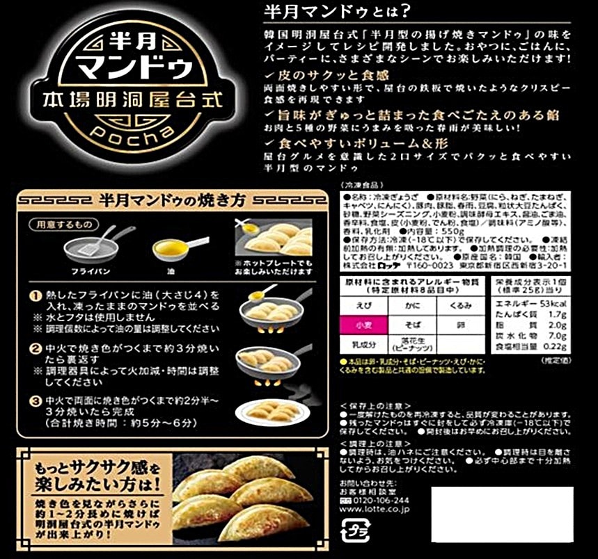 ロッテから韓国餃子が登場!韓国の明洞屋台式の半月マンドゥです。両面焼きでサクッと食感の皮と、肉・5種の野菜(にら、ねぎ、たまねぎ、キャベツ、にんにく)・春雨・豆腐などが入ってうまみがぎゅっと詰まった食べごたえのある餡をお楽しみください。