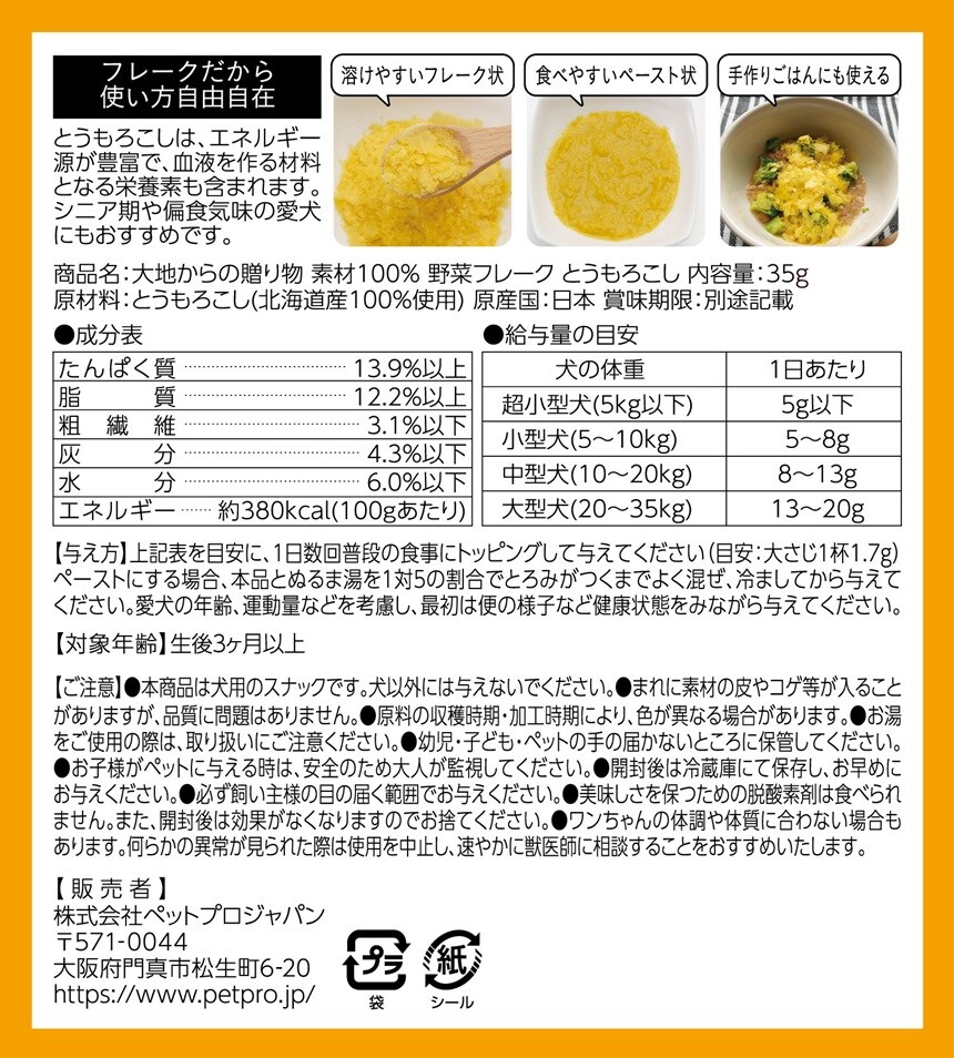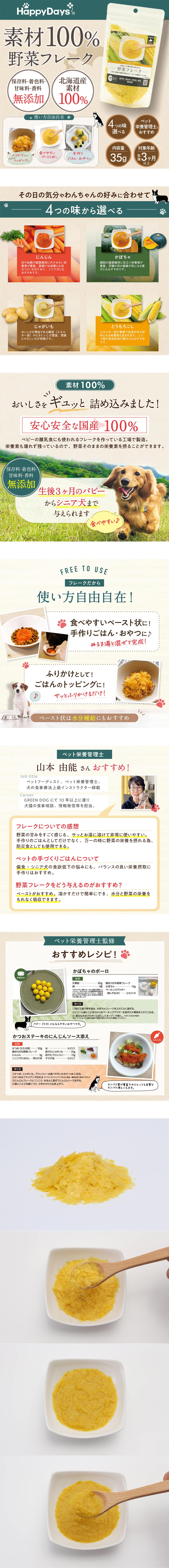 [40個]ペットプロジャパン HappyDays 大地からの贈り物 素材100%野菜フレーク とうもろこし 35g | 北海道産とうもろこしを使用、素材の栄養そのままのフレーク。