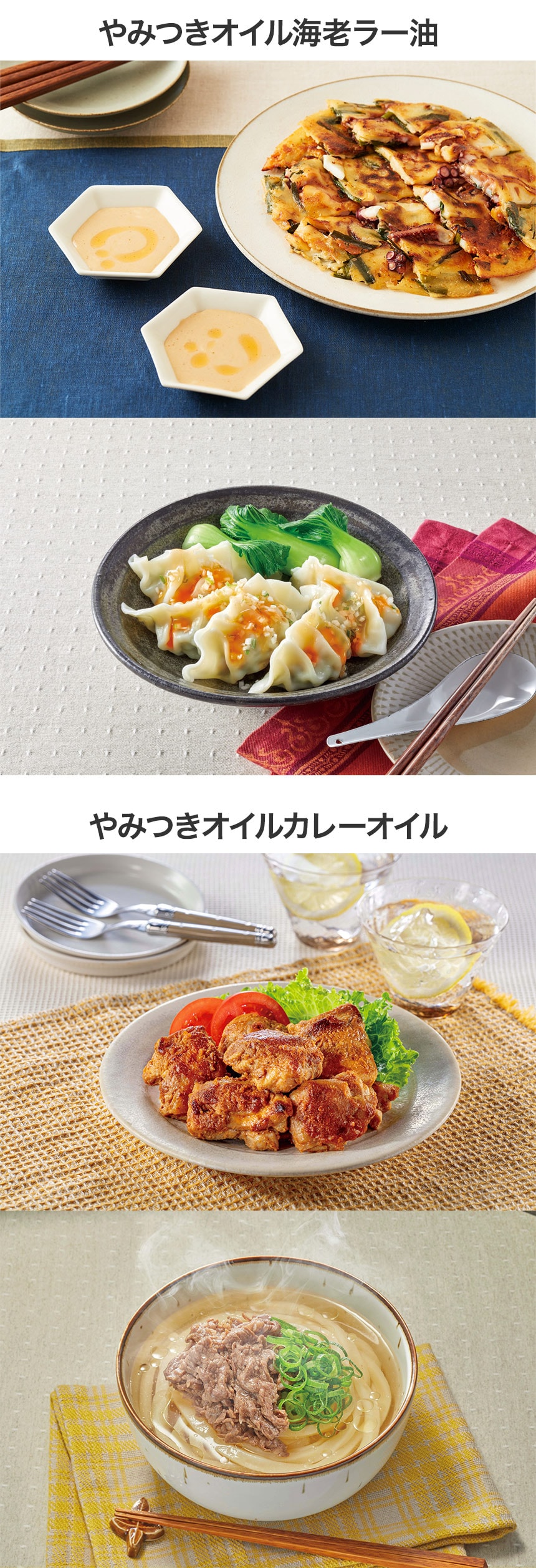 日清やみつきオイルは、いつもの料理を、かけるだけで簡単にみんなが大好きな「やみつき味」にしてしまう調味料です。