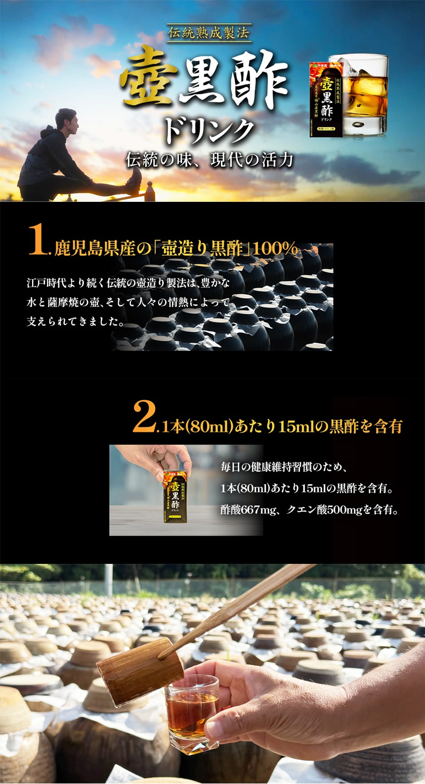 1年以上壺の中で自然発酵・熟成させ、酸味が丸く豊潤な味わいが楽しめる鹿児島県福山町産黒酢(※)使用。※お酢のうち96%以上使用。