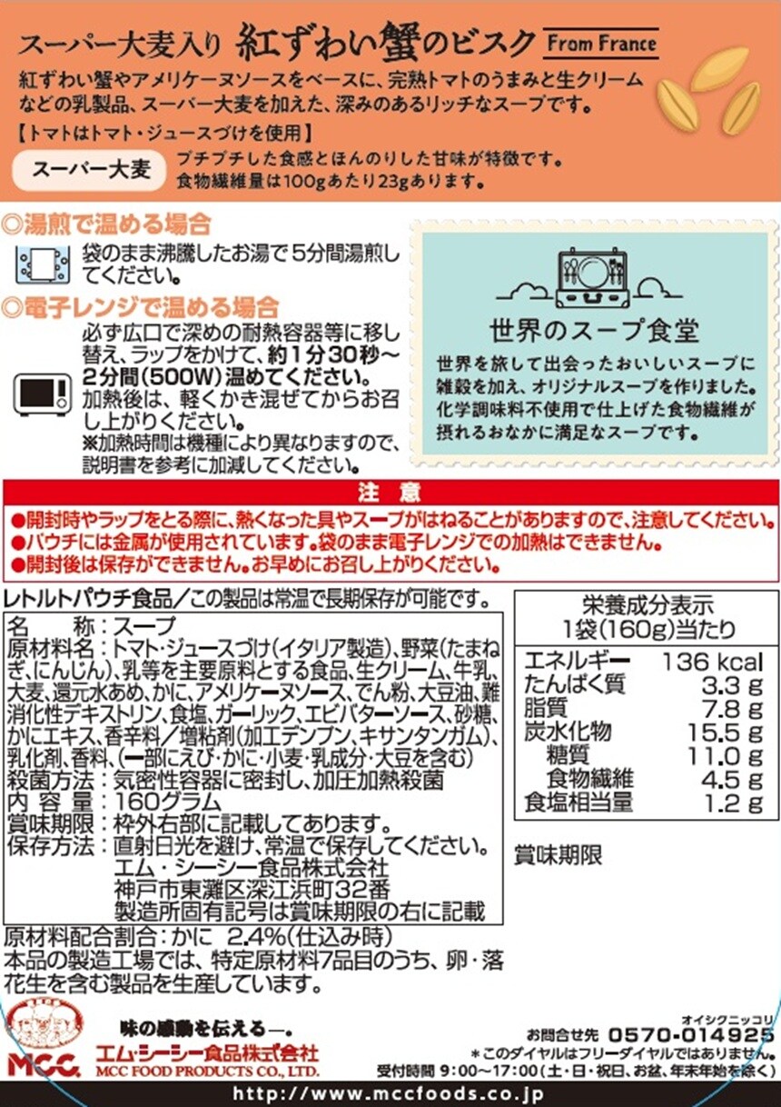 [20個]エム・シーシー食品 スーパー大麦入り紅ずわい蟹のビスク 160g | 食物繊維がおいしく摂れる