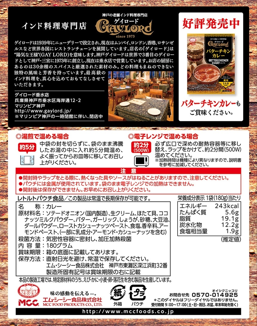 [10個]エム・シーシー食品 ゲイロード ホタテとナッツのカレー(ホタテコーマ) 180g | 神戸の老舗インド料理専門店「ゲイロード」監修