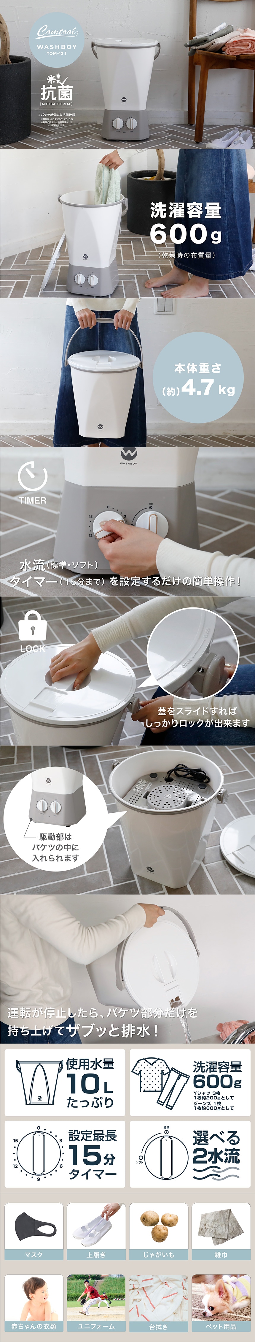 標準洗濯量/600g(乾燥時の布質量)、標準使用水量/(約)10L、電気コードの長さ/1m、定格電圧/AC100V、定格周波数/50/60Hz、定格消費電力/120W、連続運転時間/15分、セット内容/バケツ部、駆動部、取扱説明書(保証書付き)
