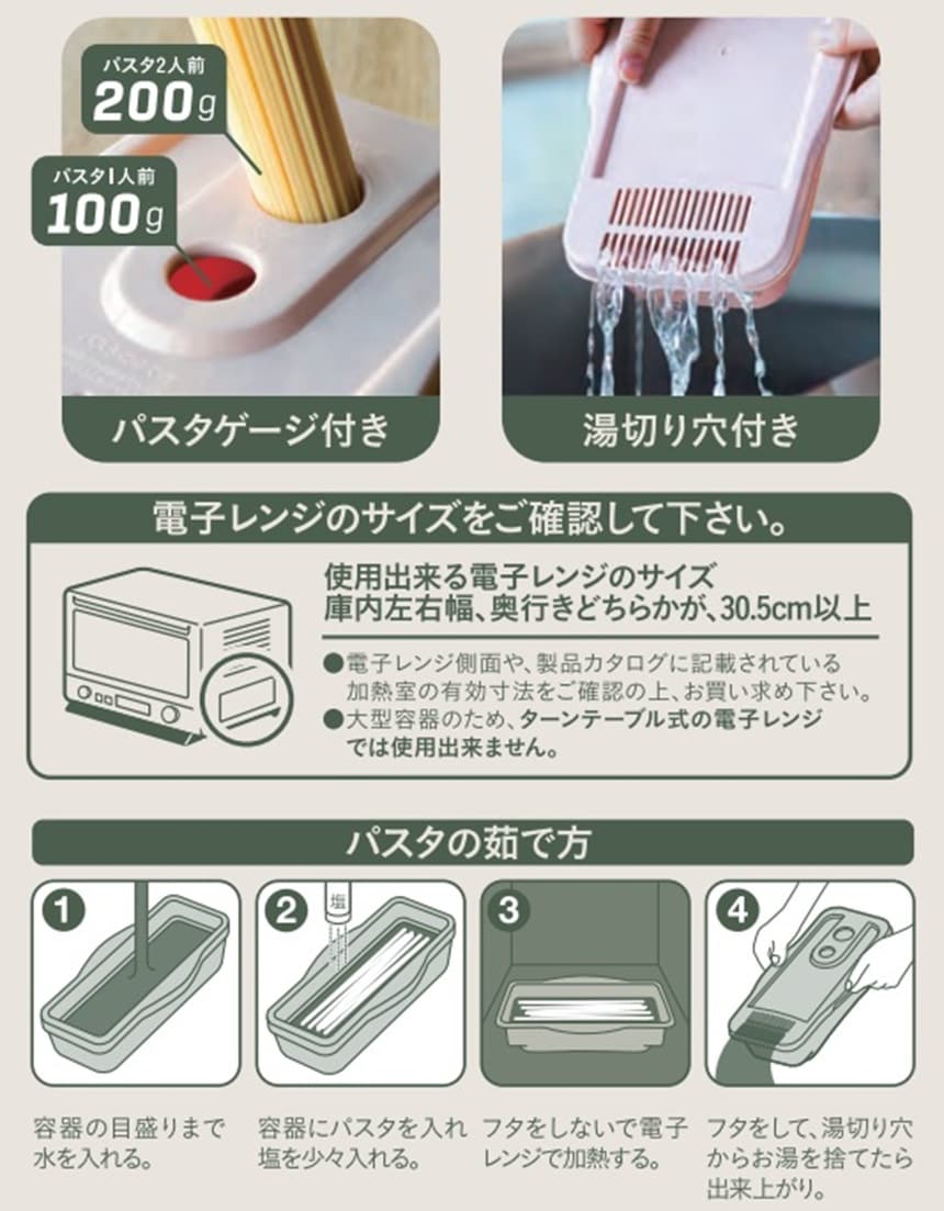 鍋やフライパンでパスタを茹でるよりも、電子レンジで簡単に作れ、茹で加減も毎回安定した麺の硬さに出来るので、いつもお好みの食感を楽しめます。
