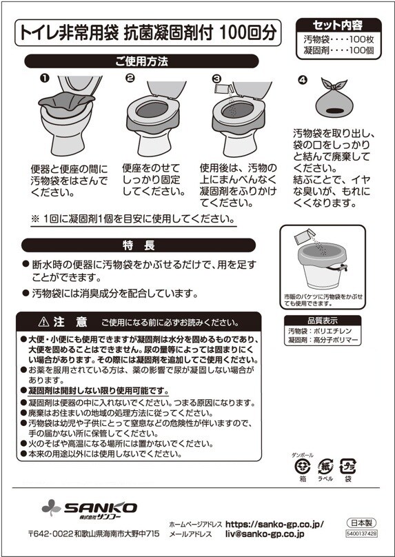 [1個]サンコー トイレ非常用袋 抗菌凝固剤付 100回分 | 水分をすばやく固め、後処理が簡単。お得な100回分入。