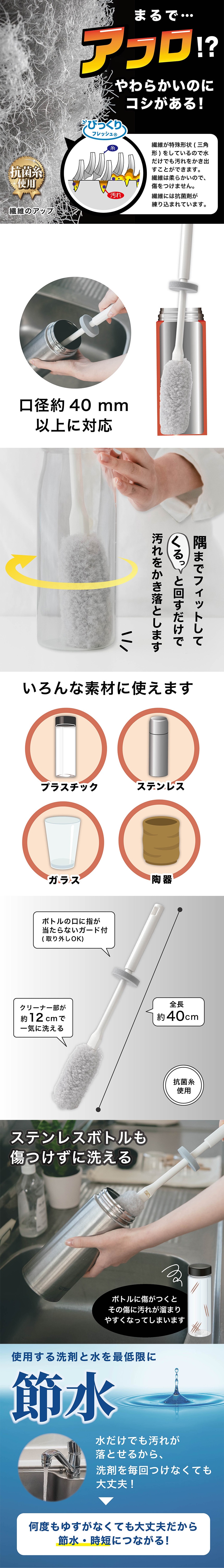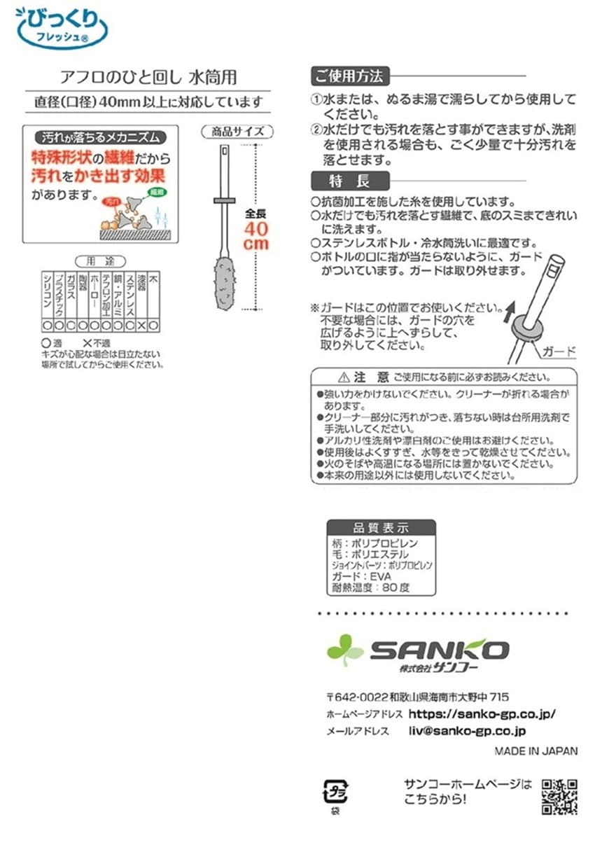 [5個]サンコー アフロのひと回し 水筒用 全長40cm | ステンレスボトルや冷水筒洗いに最適。