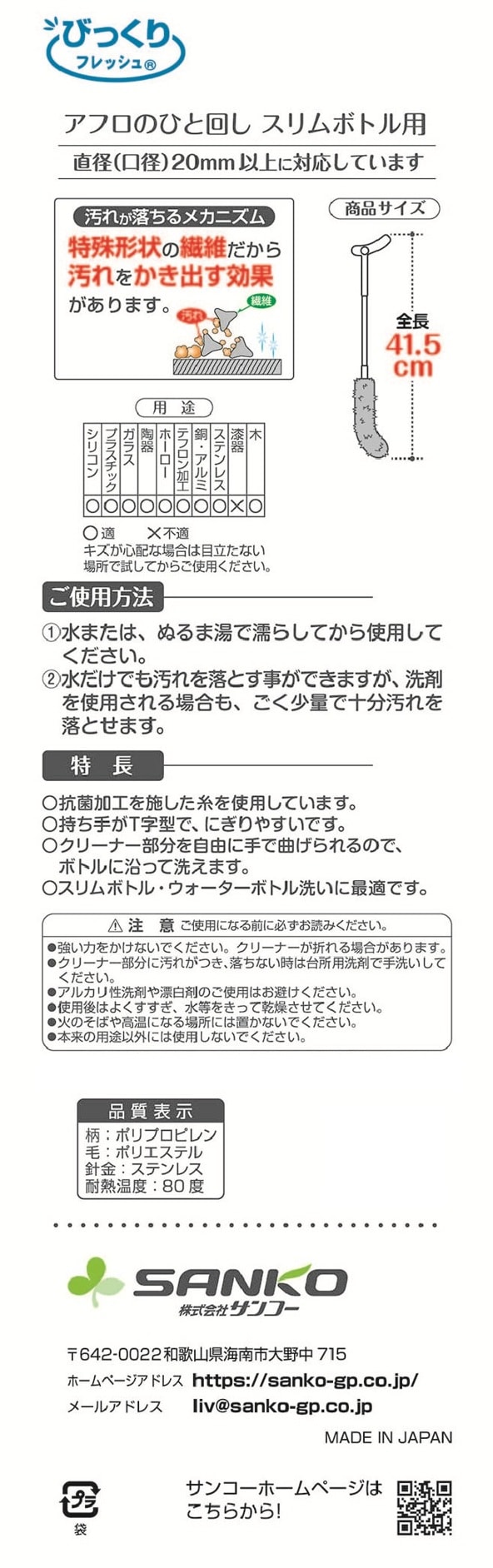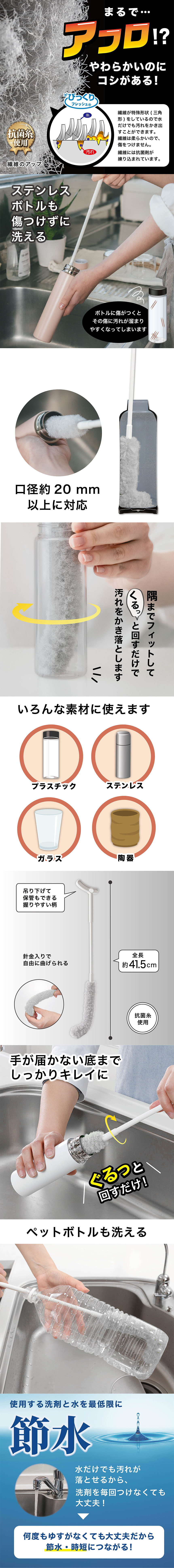 [5個]サンコー アフロのひと回し スリムボトル用 全長41.5cm | クリーナー部分を自由に手で曲げられるので、ボトルにそって洗えます。