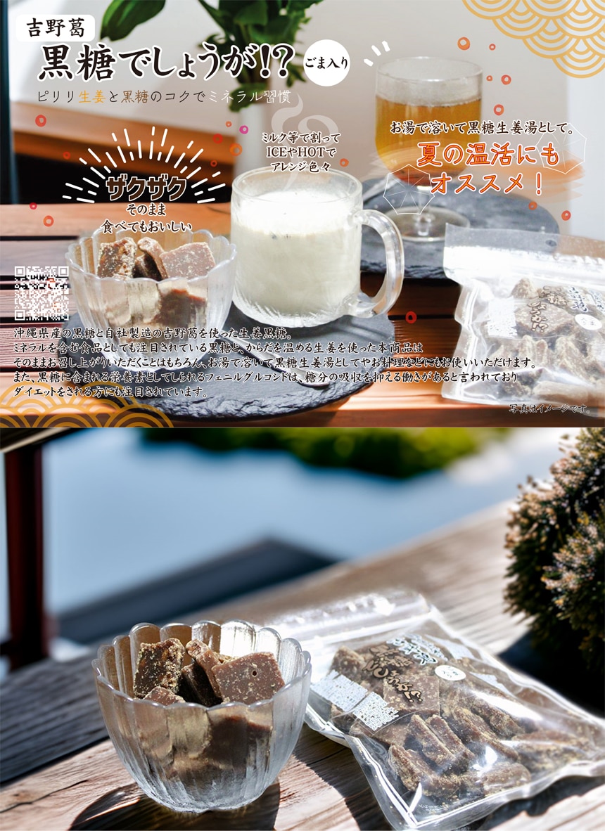 沖縄県産の黒糖と自社製造の吉野葛を使った生姜黒糖。