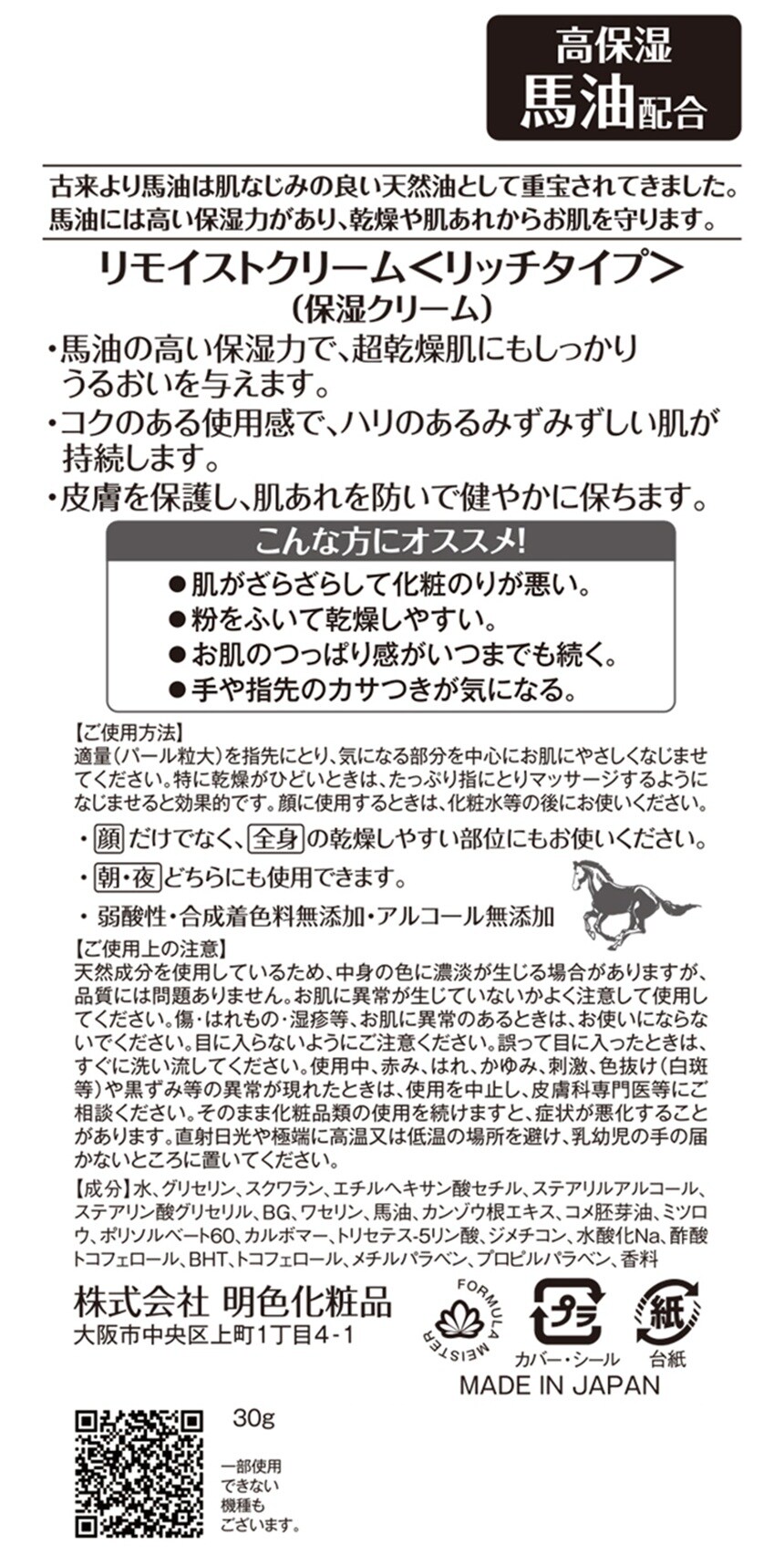 [4個]明色化粧品 リモイストクリーム リッチタイプ 30g | 馬油とスクワランで超しっとりクリーム。