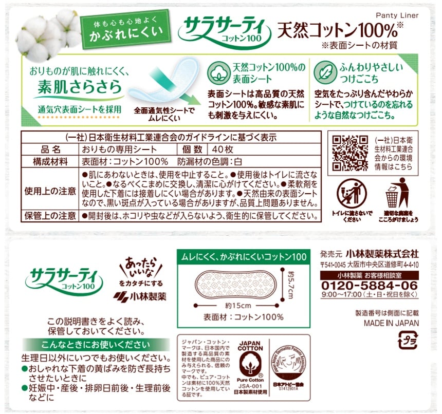 [20個]小林製薬 サラサーティ コットン100 お試し品 40個入 | ●天然コットン100%の表面シート●敏感な素肌にも刺激を与えにくく、かぶれにくい●無香料