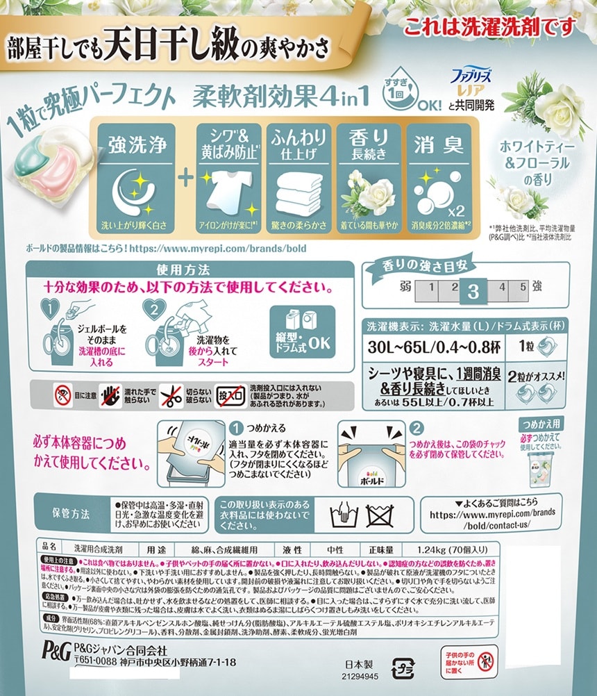 [4袋]P&Gジャパン ボールド ジェルボール4D ホワイトティー 詰替 超メガジャンボ 70個入 | トレンドのホワイトティーの香りがボールドから新登場!