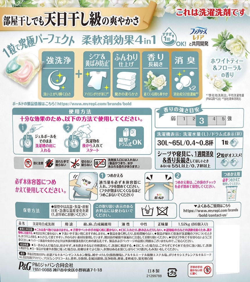 [3袋]P&Gジャパン ボールド ジェルボール4D ホワイトティー 詰替 テラジャンボ 86個入 | トレンドのホワイトティーの香りがボールドから新登場!