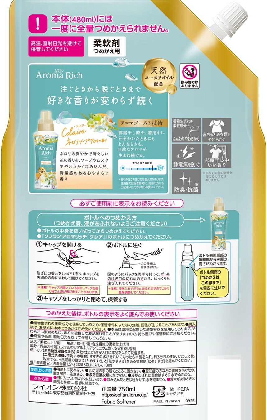 [12個]ライオン ソフラン アロマリッチ クレア 柔軟剤 つめかえ用 750ml | 好きな香りが変わらず続く、ただひとつ※の柔軟剤※当社柔軟剤において
