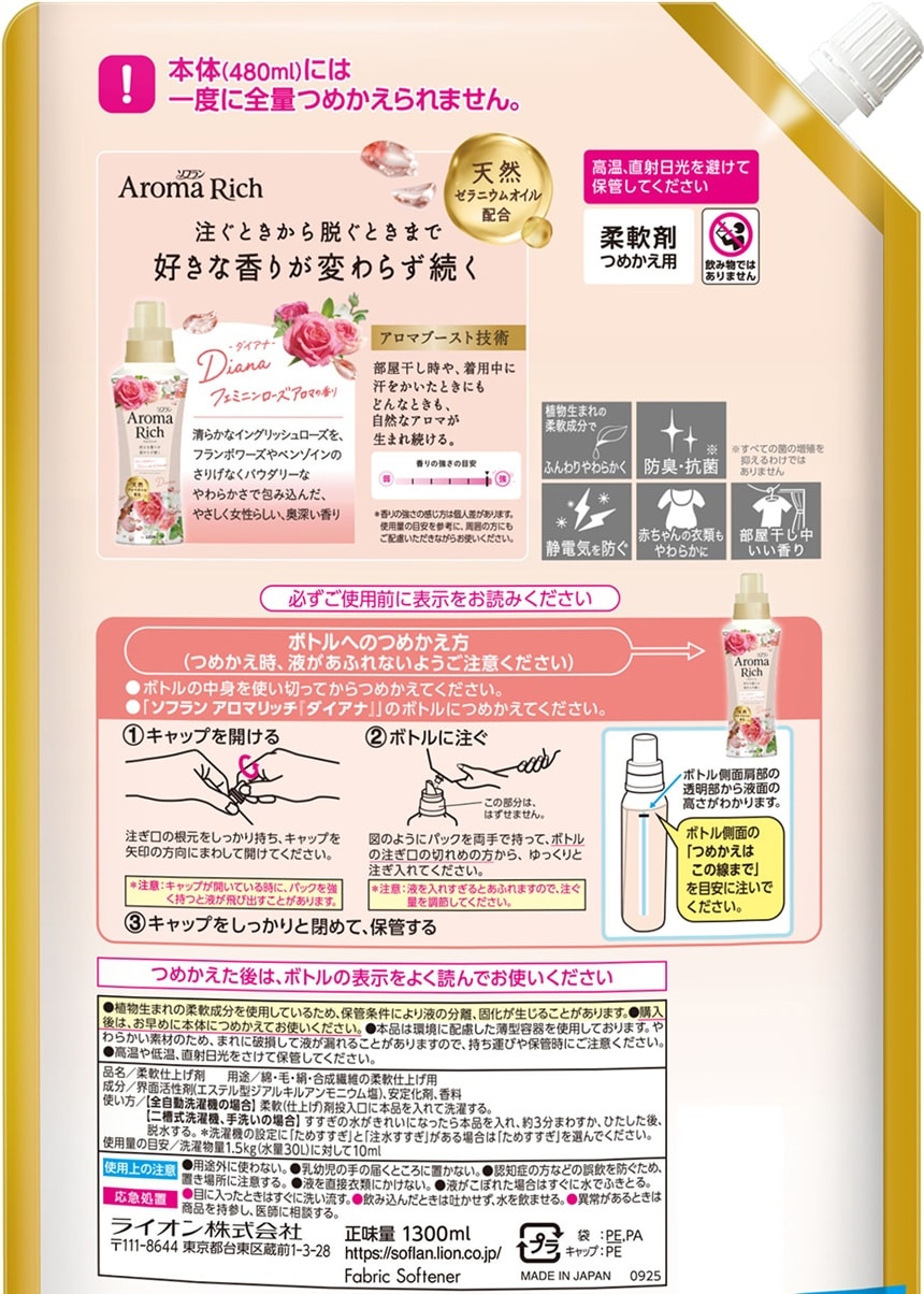 [6個]ライオン ソフラン アロマリッチ ダイアナ 柔軟剤 つめかえ用 1300ml | 好きな香りが変わらず続く、ただひとつ※の柔軟剤※当社柔軟剤において