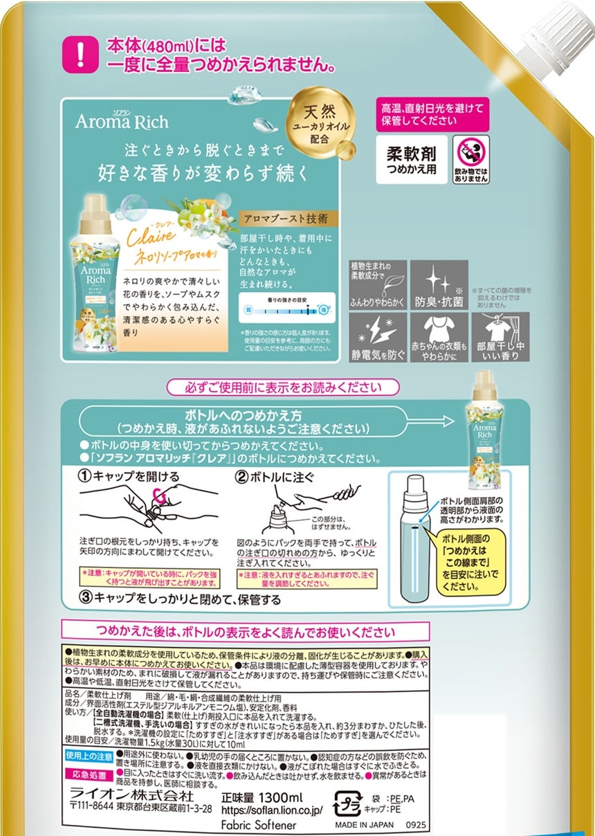 [6個]ライオン ソフラン アロマリッチ クレア 柔軟剤 つめかえ用 1300ml | 好きな香りが変わらず続く、ただひとつ※の柔軟剤※当社柔軟剤において