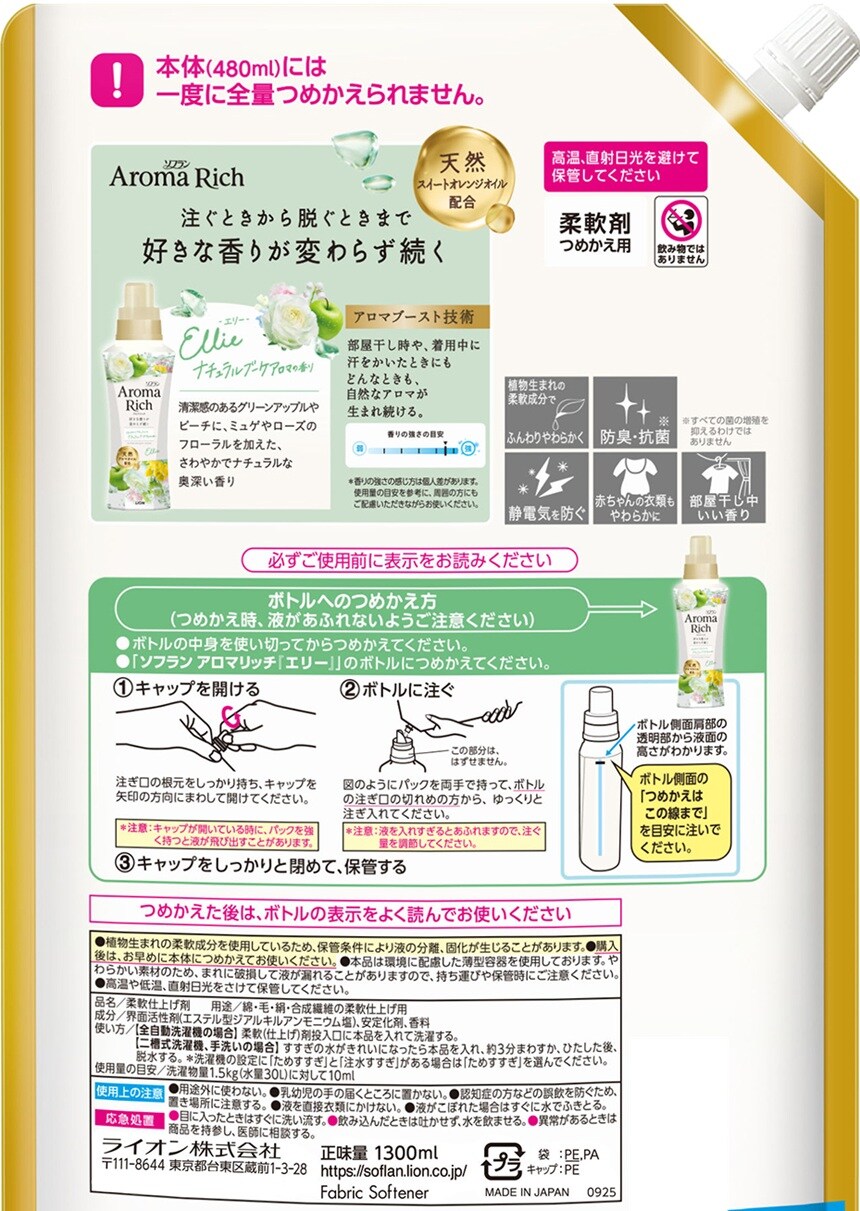 - ソフラン アロマリッチ エリー 柔軟剤 つめかえ用 1300ml