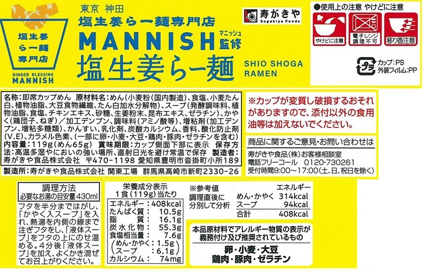 [24個]寿がきや食品 MANNISH監修 塩生姜らー麺 119g | 生姜香る塩生姜ラーメン