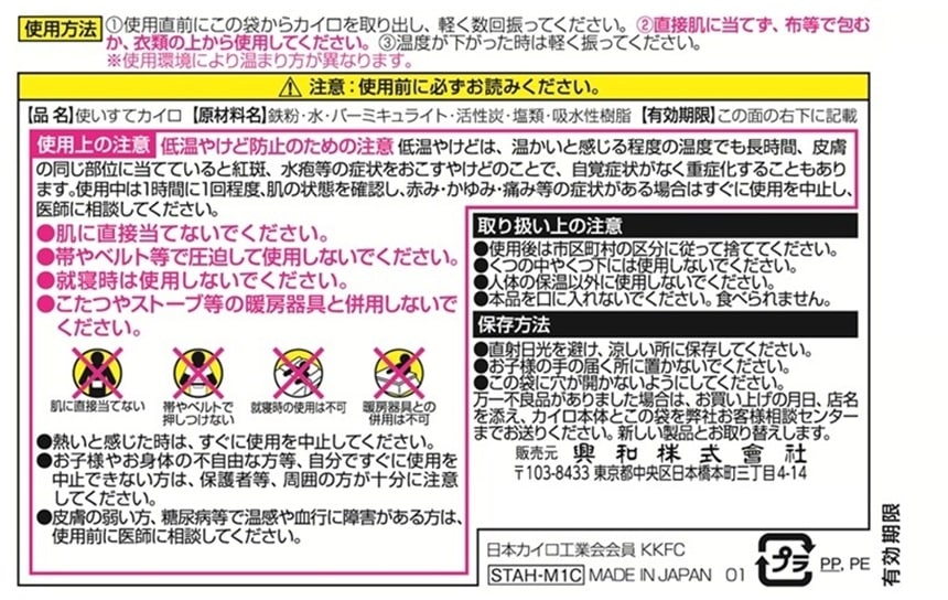 衣類に貼らないタイプのヤシガラ活性炭入りホッカイロです。