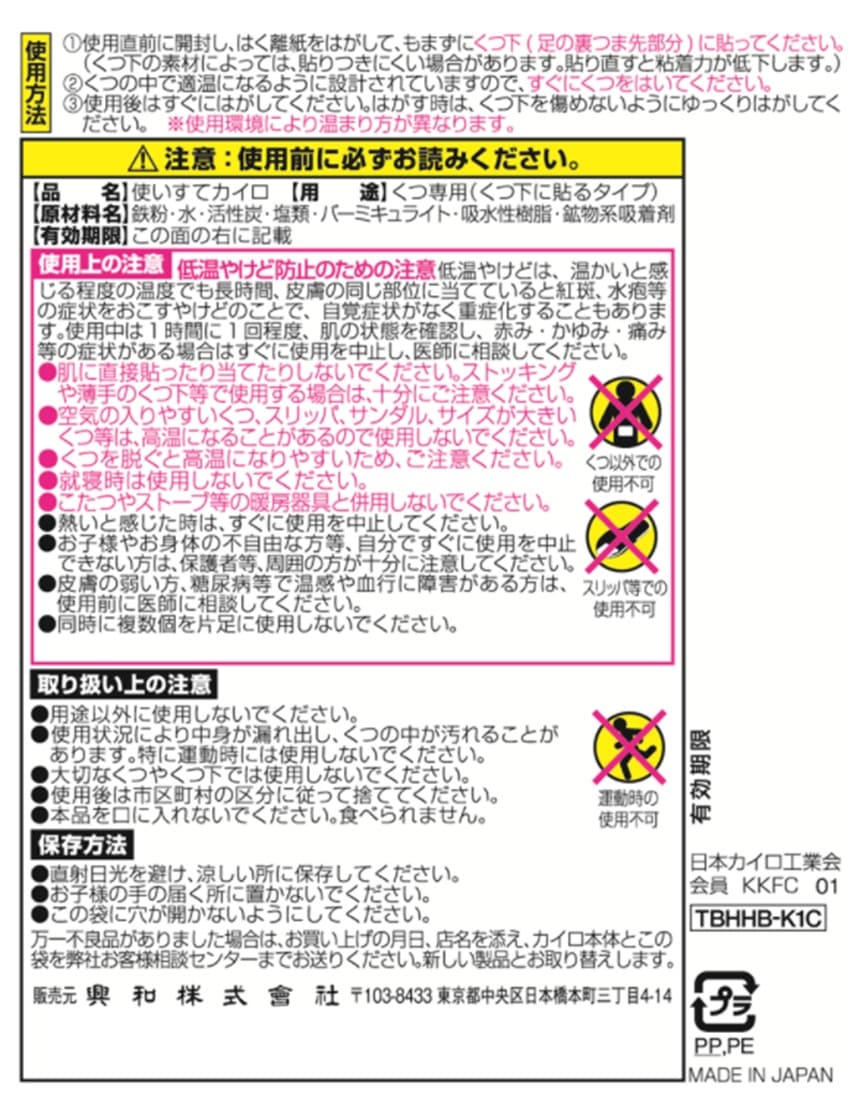 ヤシガラ活性炭入りのくつ下用ホッカイロです。
