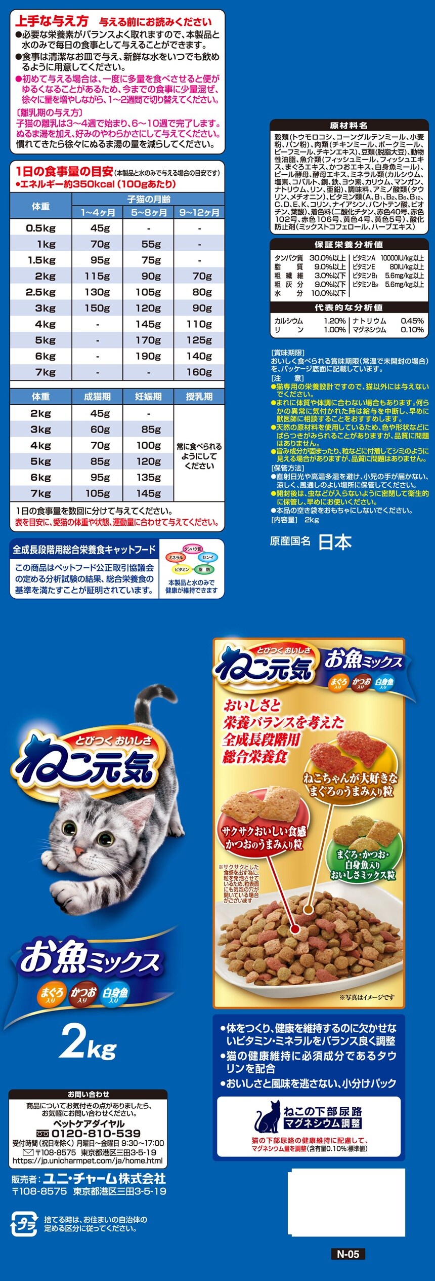 [2個]ユニ・チャーム ねこ元気 お魚ミックス まぐろ・かつお・白身魚入り 2.0kg | とびつく おいしさ!
