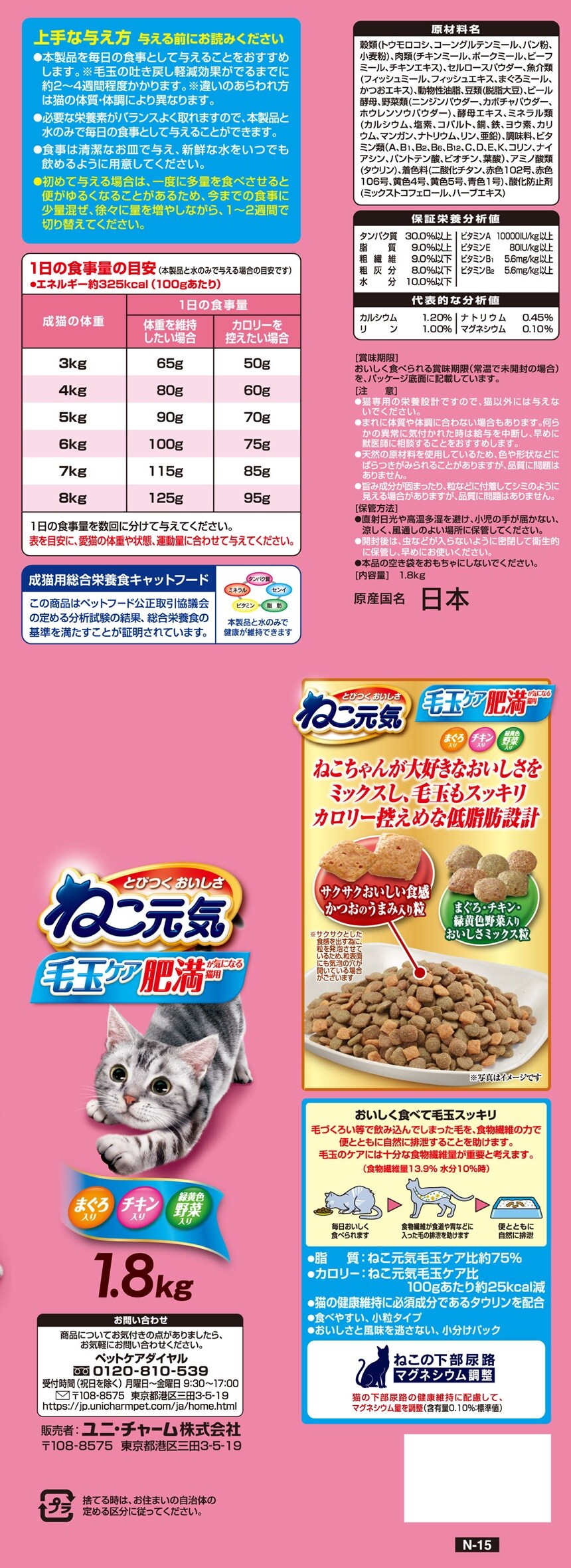 [4個]ユニ・チャーム ねこ元気 毛玉ケア 肥満が気になる猫用 まぐろ・チキン・緑黄色野菜入り 1.8kg | とびつく おいしさ!