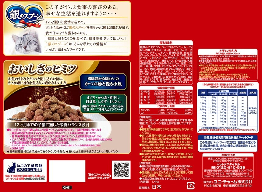 - 銀のスプーン 贅沢うまみ仕立て 健康に育つ子ねこ用 まぐろ・かつお・煮干し・白身魚・しらす入り 1.4kg