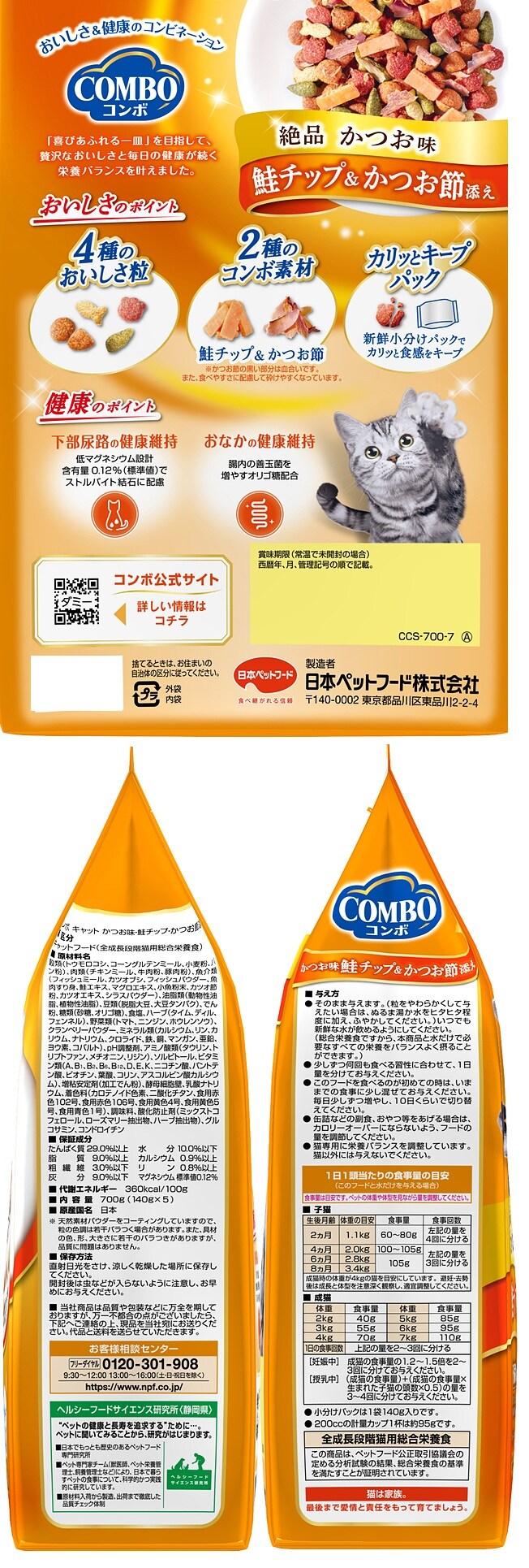 [4個]日本ペットフード コンボ キャット かつお味・鮭チップ・かつお節添え 700g(140g×5袋) | おいしさと健康にこだわった猫ちゃん思いのキャットフード!