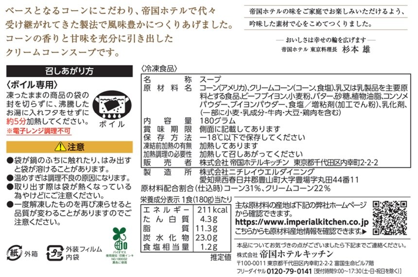 [12個]帝国ホテルキッチン 帝国ホテル クリームコーンスープ 180g | コーンの香りと甘味を充分に引き出したクリームコーンスープ