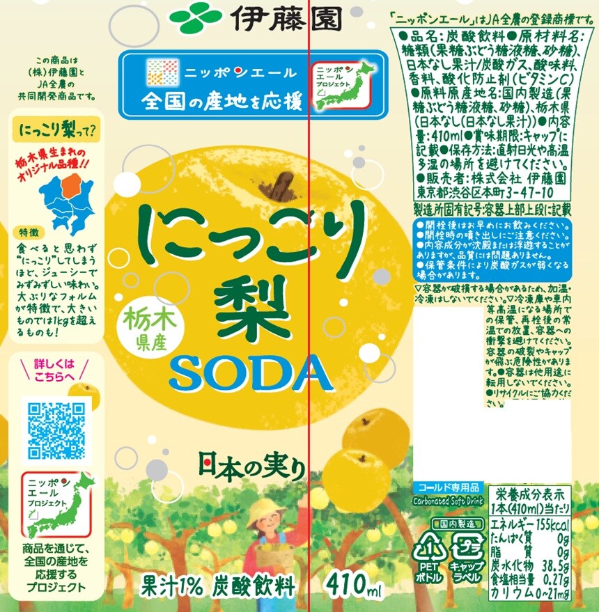 日本の農業・農畜産物を未来に繋ぐJA全農の「ニッポンエール プロジェクト」。JA全農と伊藤園が共同開発した製品です。栃木県生まれのオリジナル品種「にっこり梨」の甘さを味わえる、思わず“にっこり”してしまうおいしさの炭酸飲料(果汁1%)です。