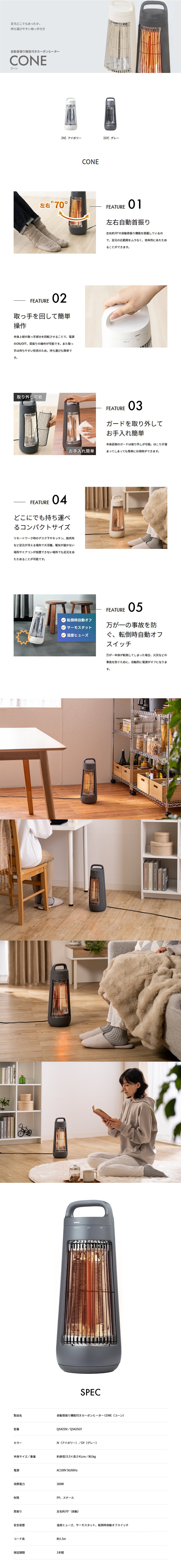 [グレー] クワッズ/自動首振り機能付き カーボンヒーター「コーン」|足元どこでもあったか!持ち運びやすい取っ手付。左右約70°の自動首振り機能を搭載!足元の広範囲をムラなく、効率的にあたためる。