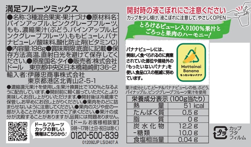 ・フルーツカップ 満足フルーツミックス 198g×18個 - 賞味期限