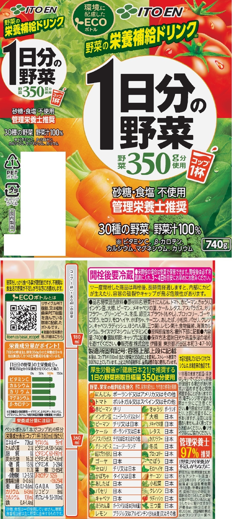 コップ1杯当たり1日の野菜摂取目標量350g分を使用した、野菜汁100%飲料です。