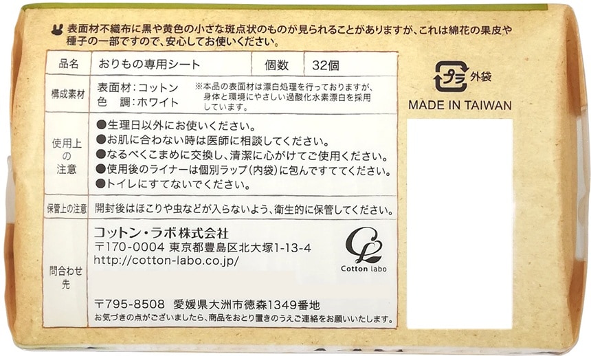 [12個]コットン・ラボ オーガニックコットンライナーロング 32枚入 | お肌に触れる表面シートは、オーガニックコットン100%