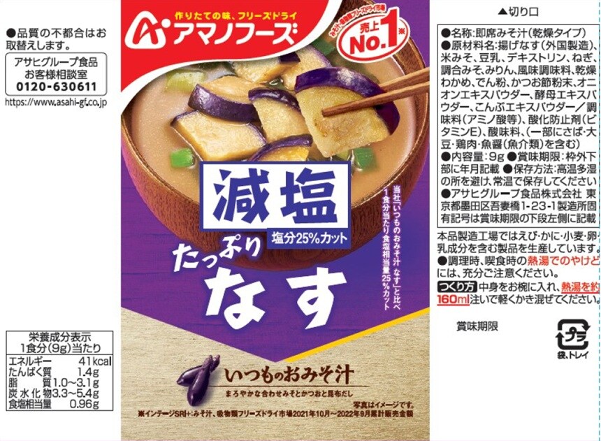 飲みやすい定番の味わいに仕上げた、減塩タイプのなすのおみそ汁です。