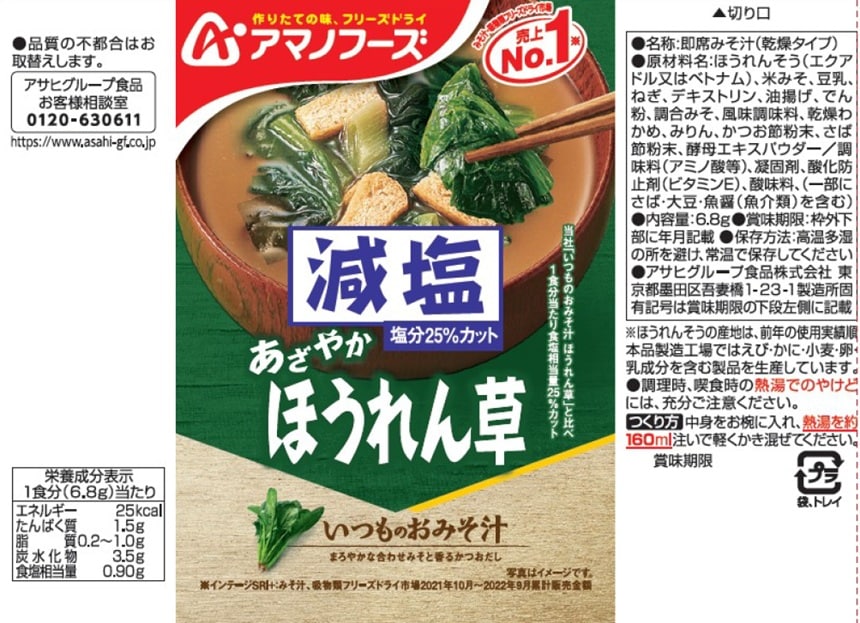 飲みやすい定番の味わいに仕上げた、減塩タイプのほうれん草のおみそ汁です