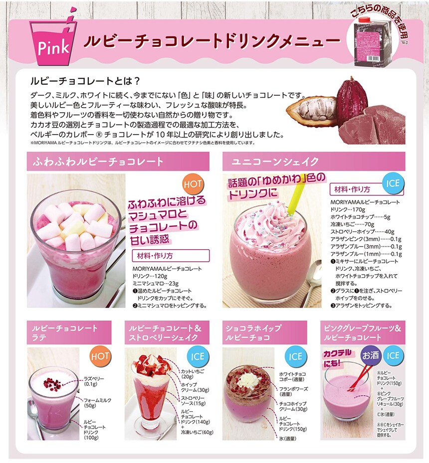ルビーピンク色のフル―ティーな味わいのチョコレートドリンクです。