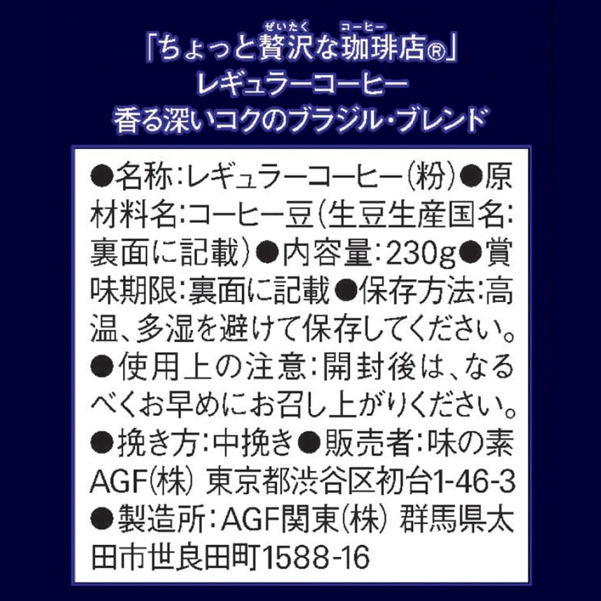 "香り引き出す、じっくり焙煎。"「ちょっと贅沢な珈琲店」レギュラー・コーヒーは、厳選した豆の特徴に合わせて、AGF独自の「T2ACMI焙煎」技術により、丁寧に焙煎した豊かなコクと深く濃い香り。珈琲店のマスターがハンドドリップで淹れたような贅を尽くした奥深い味わいと香りが楽しめるレギュラーコーヒー粉です。AGF(エージーエフ) 「ちょっと贅沢な珈琲店」 レギュラー・コーヒー 香る深いコクのブラジル・ブレンド 230gは、持続可能なコーヒー豆の生産と品質向上に取り組むコーペルカム農協のブラジル産コーヒー豆を10%使用した、ナッツのような香ばしさと調和のとれた味わいの、こだわりの一杯をご堪能いただけます。コーヒードリッパーとペーパーフィルターを使用し、コーヒーサーバーや直接コーヒーカップに乗せて、コーヒーメジャーなどで容量を計ってドリップコーヒーをお楽しみください。もちろん、コーヒーメーカー、サイフォン、水出し用のアイスコーヒー 粉として水出しコーヒーポット・ボトル等、いずれの器具でもお楽しみいただけます。コーヒー豆の焙煎から充填まで国内の工場で生産し、繊細な日本の味覚に合わせて開発。誰にも邪魔をされず、ゆっくりしたい。1日の中で訪れる、ささやかでありながら、ちょっと贅沢な時間。そんな時間にふさわしいコーヒーです。※「粉」なので、コーヒーミルは不要です。
