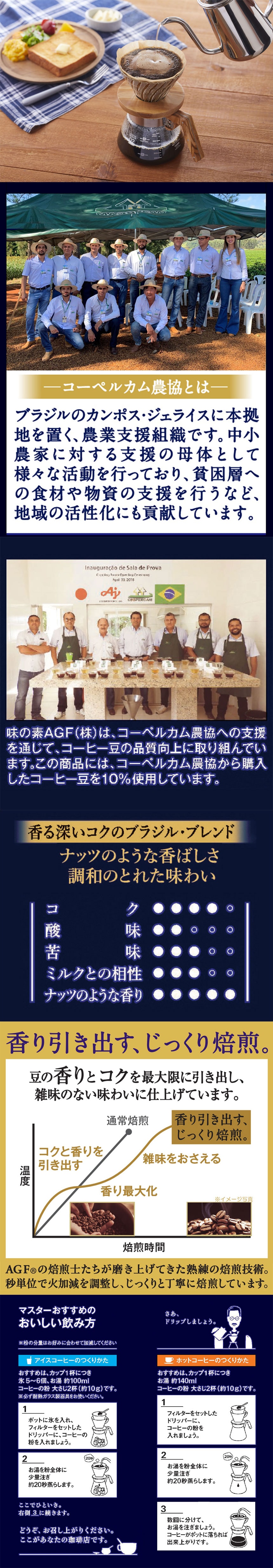 "香り引き出す、じっくり焙煎。"「ちょっと贅沢な珈琲店」レギュラー・コーヒーは、厳選した豆の特徴に合わせて、AGF独自の「T2ACMI焙煎」技術により、丁寧に焙煎した豊かなコクと深く濃い香り。珈琲店のマスターがハンドドリップで淹れたような贅を尽くした奥深い味わいと香りが楽しめるレギュラーコーヒー粉です。AGF(エージーエフ) 「ちょっと贅沢な珈琲店」 レギュラー・コーヒー 香る深いコクのブラジル・ブレンド 230gは、持続可能なコーヒー豆の生産と品質向上に取り組むコーペルカム農協のブラジル産コーヒー豆を10%使用した、ナッツのような香ばしさと調和のとれた味わいの、こだわりの一杯をご堪能いただけます。コーヒードリッパーとペーパーフィルターを使用し、コーヒーサーバーや直接コーヒーカップに乗せて、コーヒーメジャーなどで容量を計ってドリップコーヒーをお楽しみください。もちろん、コーヒーメーカー、サイフォン、水出し用のアイスコーヒー 粉として水出しコーヒーポット・ボトル等、いずれの器具でもお楽しみいただけます。コーヒー豆の焙煎から充填まで国内の工場で生産し、繊細な日本の味覚に合わせて開発。誰にも邪魔をされず、ゆっくりしたい。1日の中で訪れる、ささやかでありながら、ちょっと贅沢な時間。そんな時間にふさわしいコーヒーです。※「粉」なので、コーヒーミルは不要です。