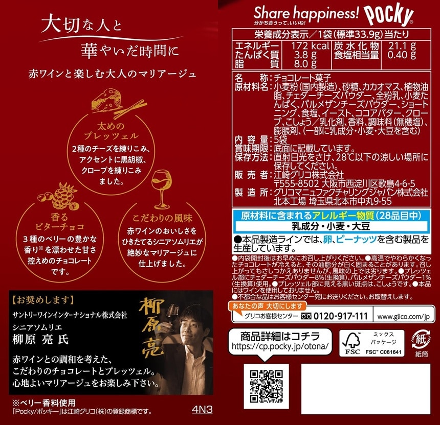 プレッツェルの生地にチェダーチーズ、黒胡椒、クローブを練り込んだ濃厚な味わい。ビターチョコレートに3種のベリーで香りづけした華やかな味わいのポッキーです。