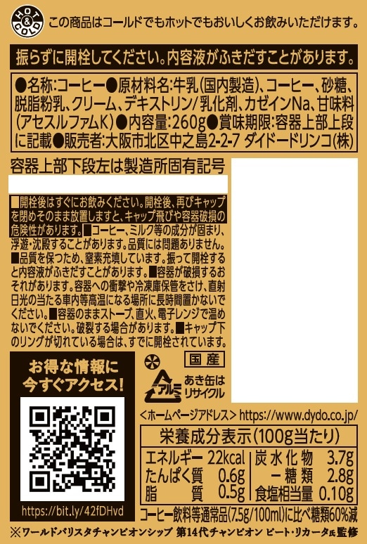 [48本]ダイドードリンコ ダイドーブレンド微糖 コーヒーラボ 世界一のバリスタ監修 260g | 世界一のバリスタが研究して作り上げた、カフェで飲めるような上質な味わい。