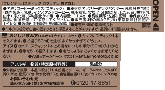 「ブレンディⓇ」スティック カフェオレ 甘さなし 11.4g×3本
