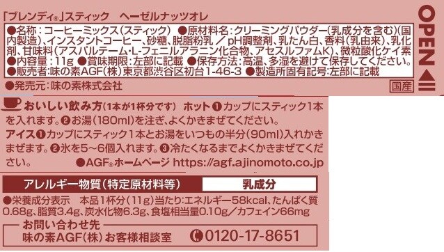 「ブレンディⓇ」スティック ヘーゼルナッツオレ 11g×6本