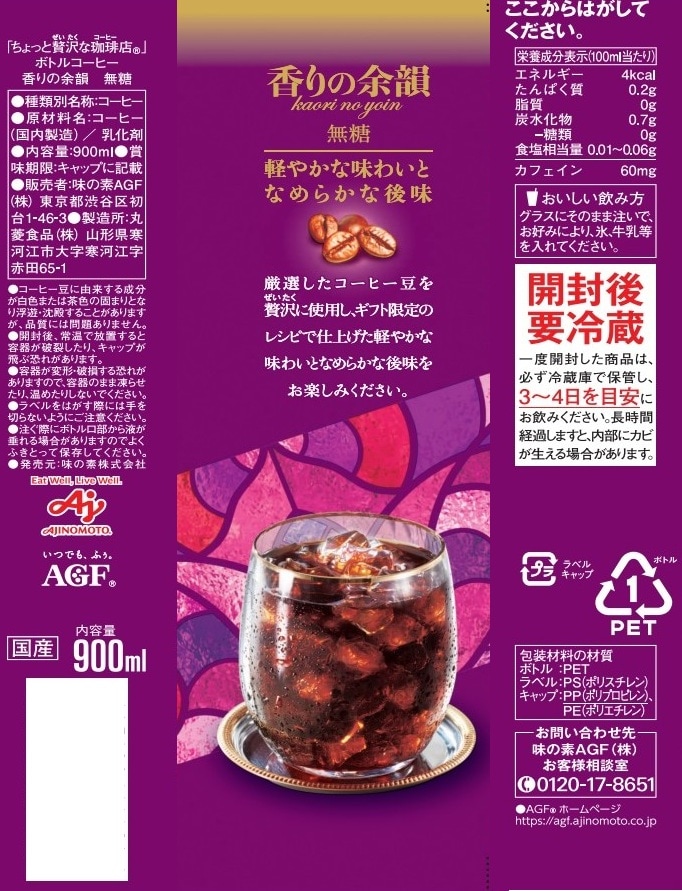・「ちょっと贅沢な珈琲店」ボトルコーヒー 香りの余韻 無糖 900ml×5本
