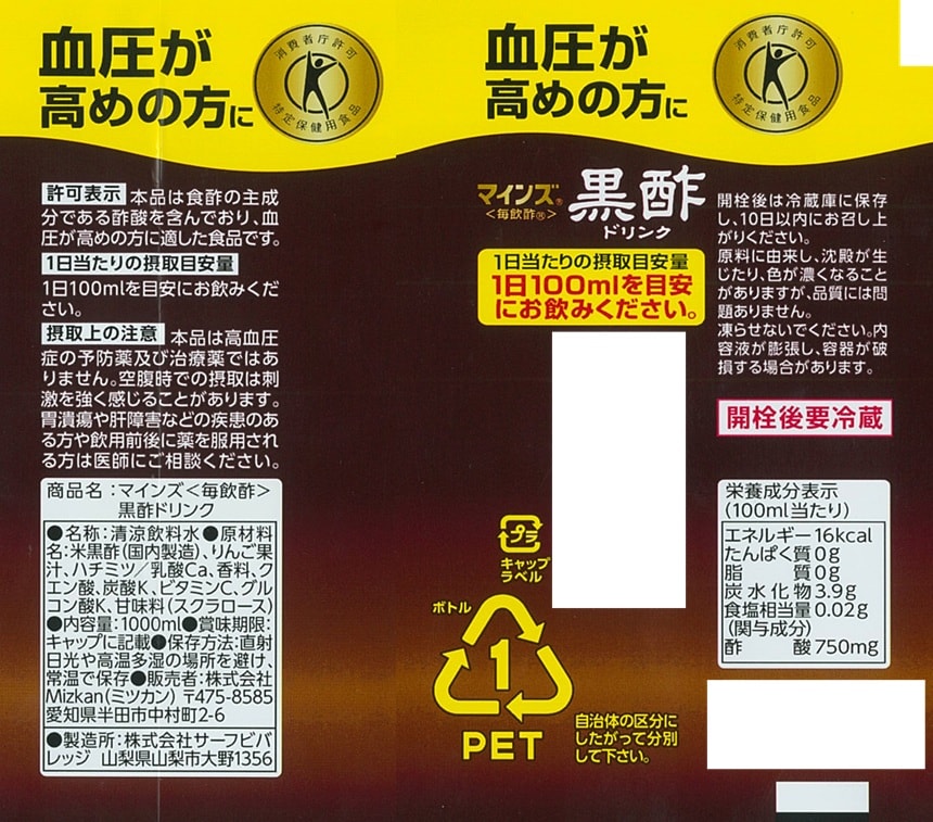 許可表示:本品は食酢の主成分である酢酸を含んでおり、血圧が高めの方に適した食品です。