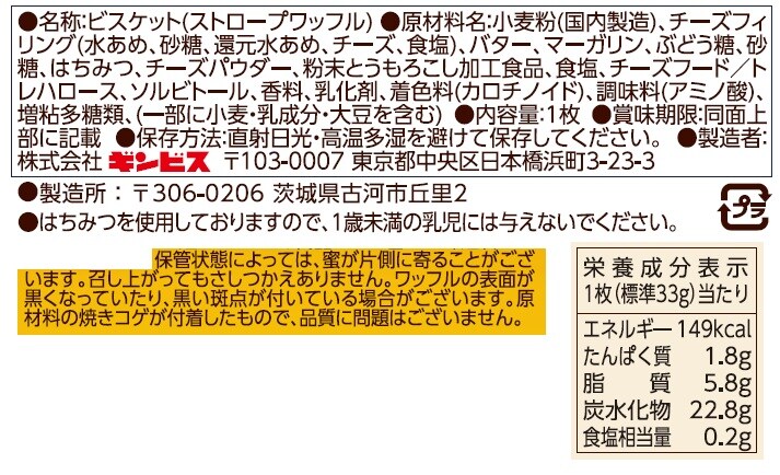 [60枚]ギンビス ギンザワッフル 蜂蜜&チーズ | 蜂蜜(甘み)×チーズ(塩気)の黄金レシピ!
