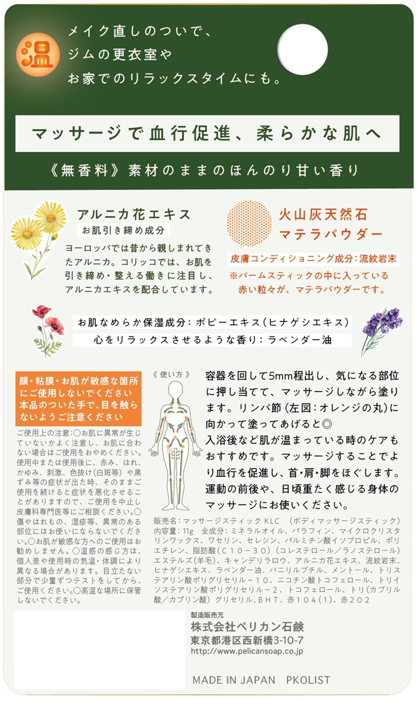 [6個]ペリカン石鹸 COliCCO 11g | マッサージで血行促進、柔肌へ。スティックタイプの温感オイル。