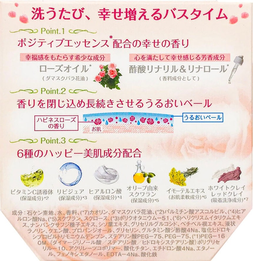 ●ポイントは幸福感をもたらす成分である酢酸リナリル、リナロール、ローズオイルを配合したハピネスローズの香り。