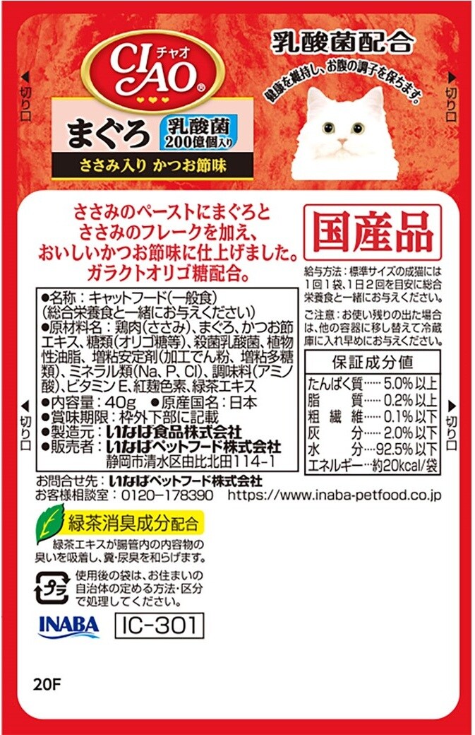 [96個]いなばペットフード CIAO パウチ 乳酸菌入り まぐろ ささみ入りかつお節味 40g | いつもの食事やおやつに♪